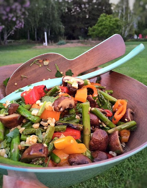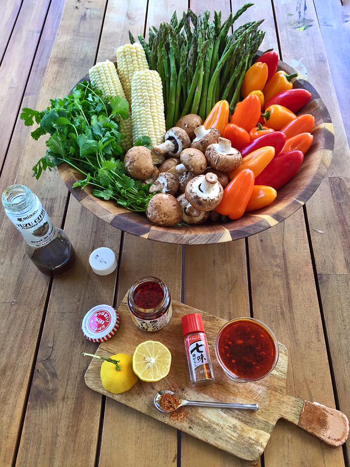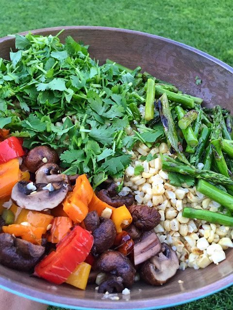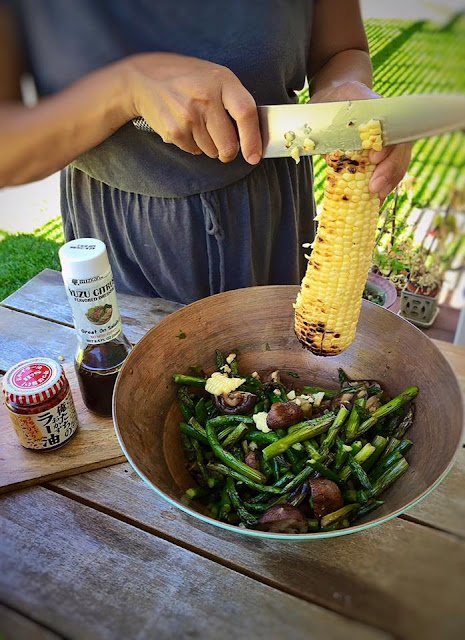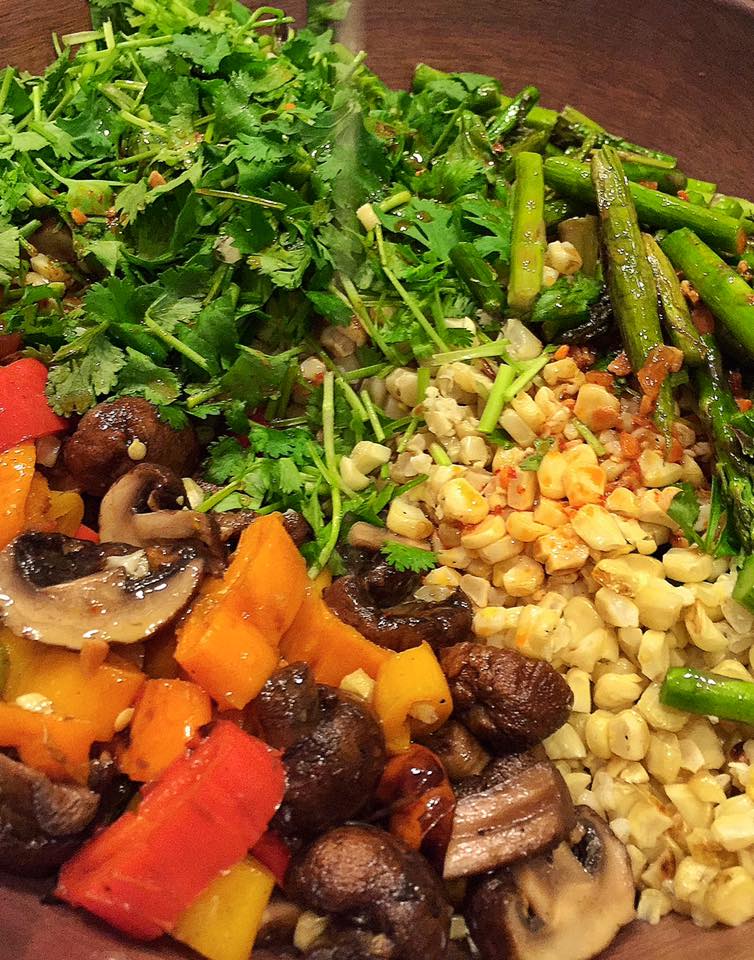 So let us enjoy the fruits and fresh veggies of the season for as long as they last. Let’s taste the sweet summertime in a salad bowl filled with grilled vegetables bursting with colors – the red and orange of sweet peppers, the green of asparagus, the yellow of corn, and earthy color of baby Bella mushrooms. These charred sweetness are then tossed with yuzu dressing, chili oil with crunchy garlic, squeezes of lemon, and a sprinkling of fresh cilantro for the perfect summer side dish. This flavorful grilled veggies are loaded with so much healthy summer favorites that you just can’t resist.