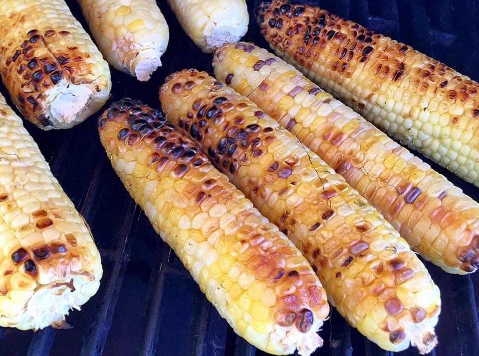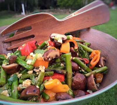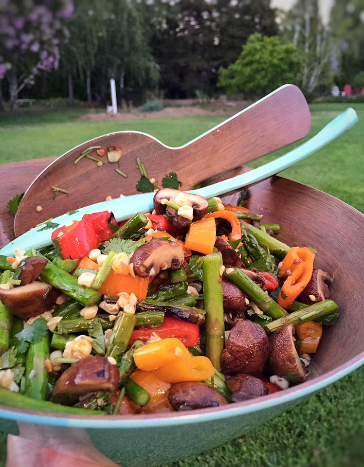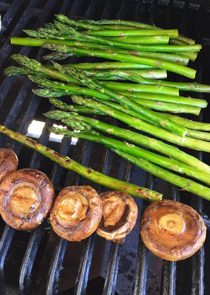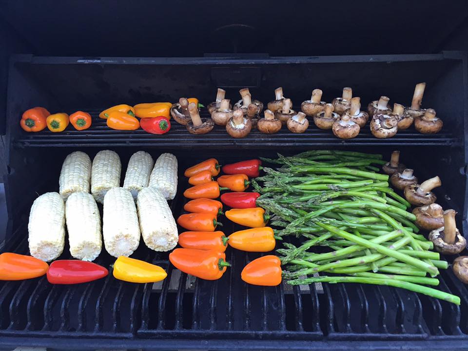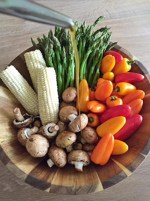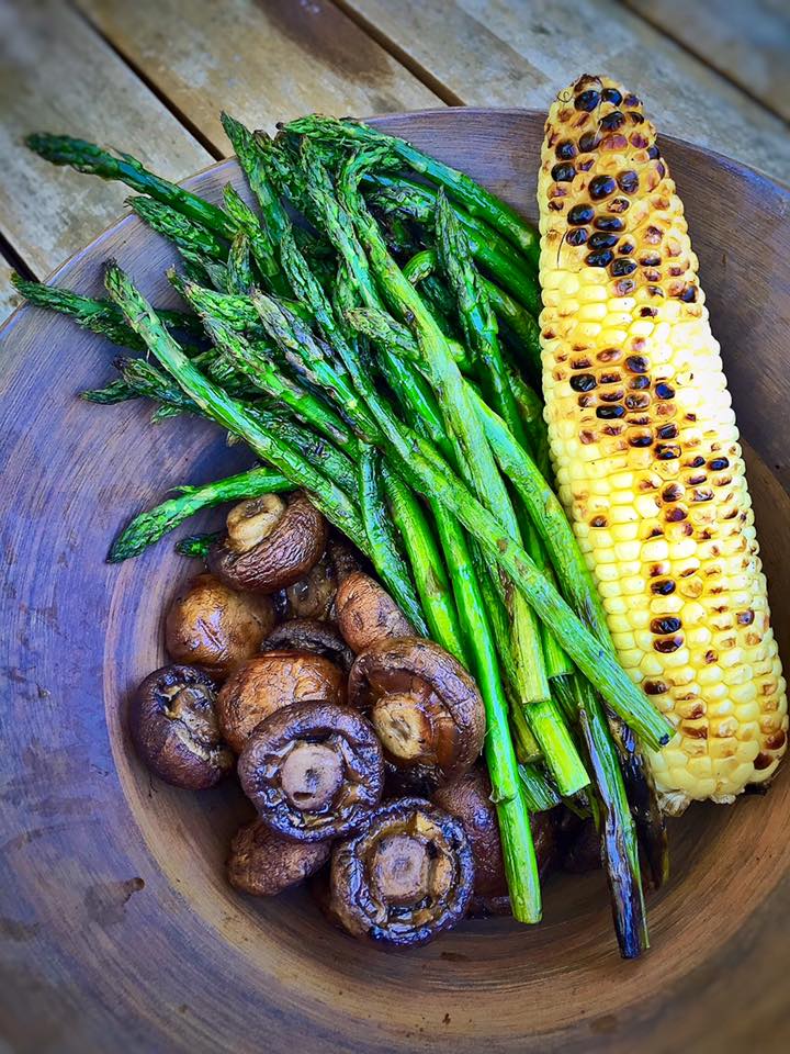 Grill the vegetables on medium heat, turning occasionally, until charred and tender, about 5 to 6 minutes. Cut asparagus into 1-inch pieces. Cut mushroom into quarters. Cut sweet peppers into half an inch pieces. Cut the corn off the cob by holding the top of the corn cob firmly, and use the knife to slice from top to bottom, letting the blade run right along the cob.