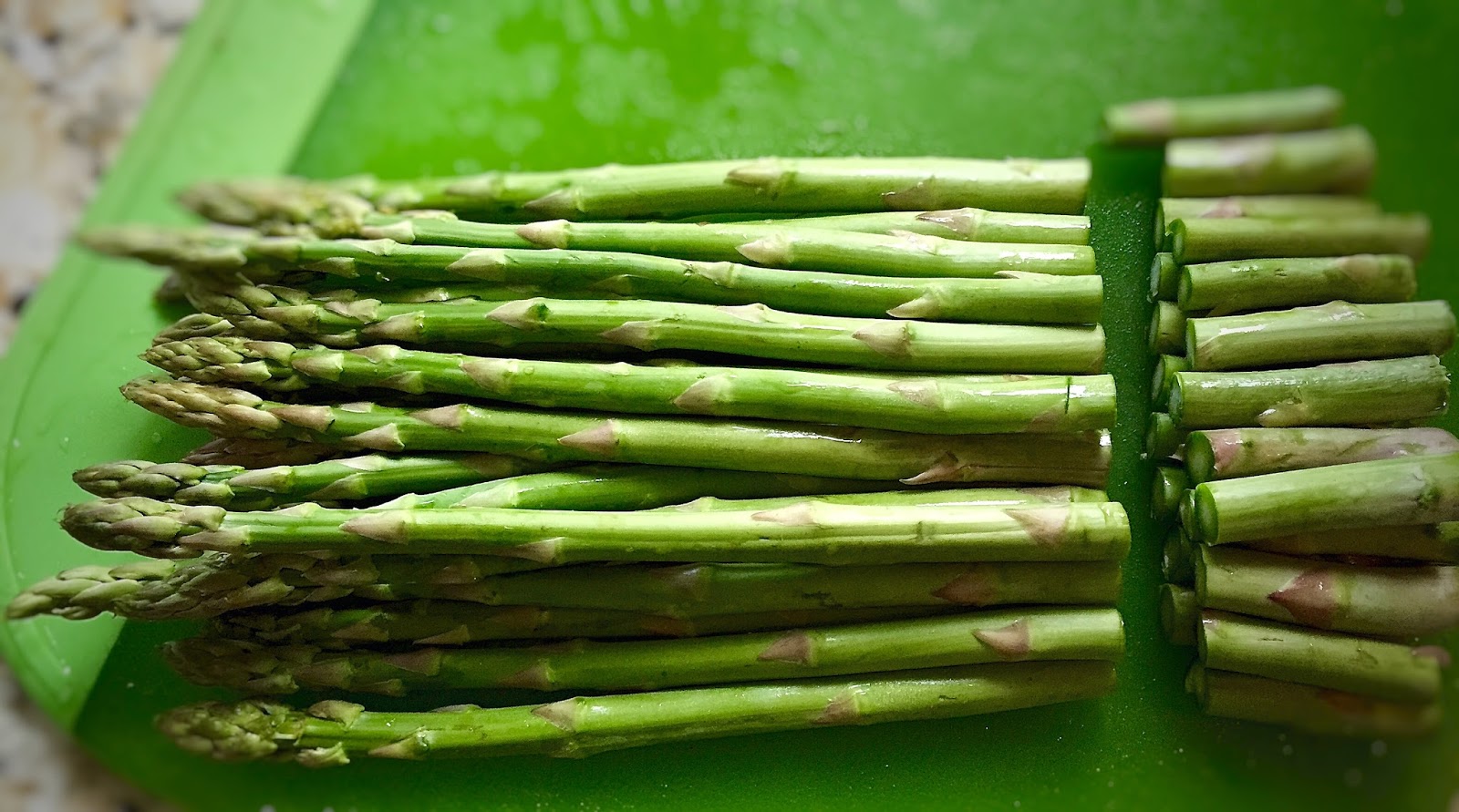 Wash and trim off the bottom ends of the asparagus stalks. Find the area where the green color begins to fade. This is where the tough woody end begins and is where the stalk should be trimmed off and discarded.