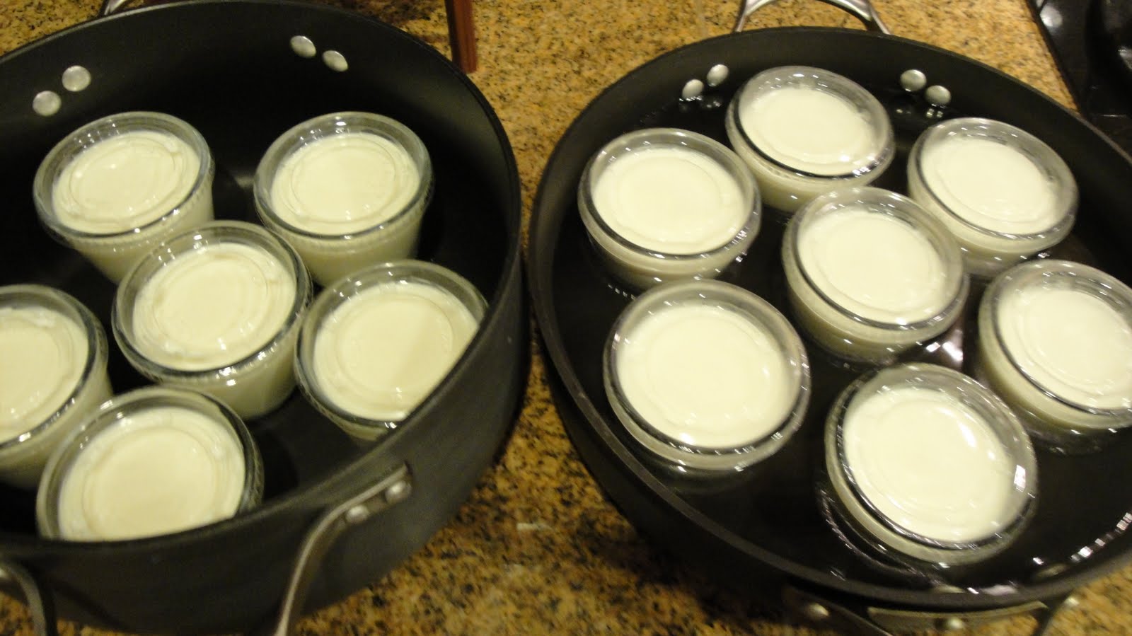 Put the yogurt jars or cups in a large pot. Heat up water to near boil (not boiling). If your water is boiling, just turn the heat off and wait for the bubble to settle down. Then pour hot water carefully into the pot or container for water bath until the water has reached almost to the top of your yogurt jars or cups. You might want to use a funnel to pour water into the pot so water won’t get into the yogurt.