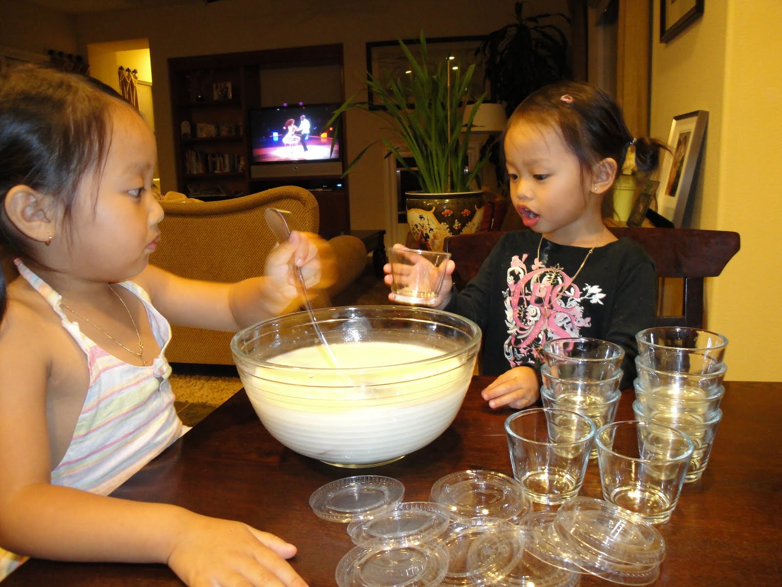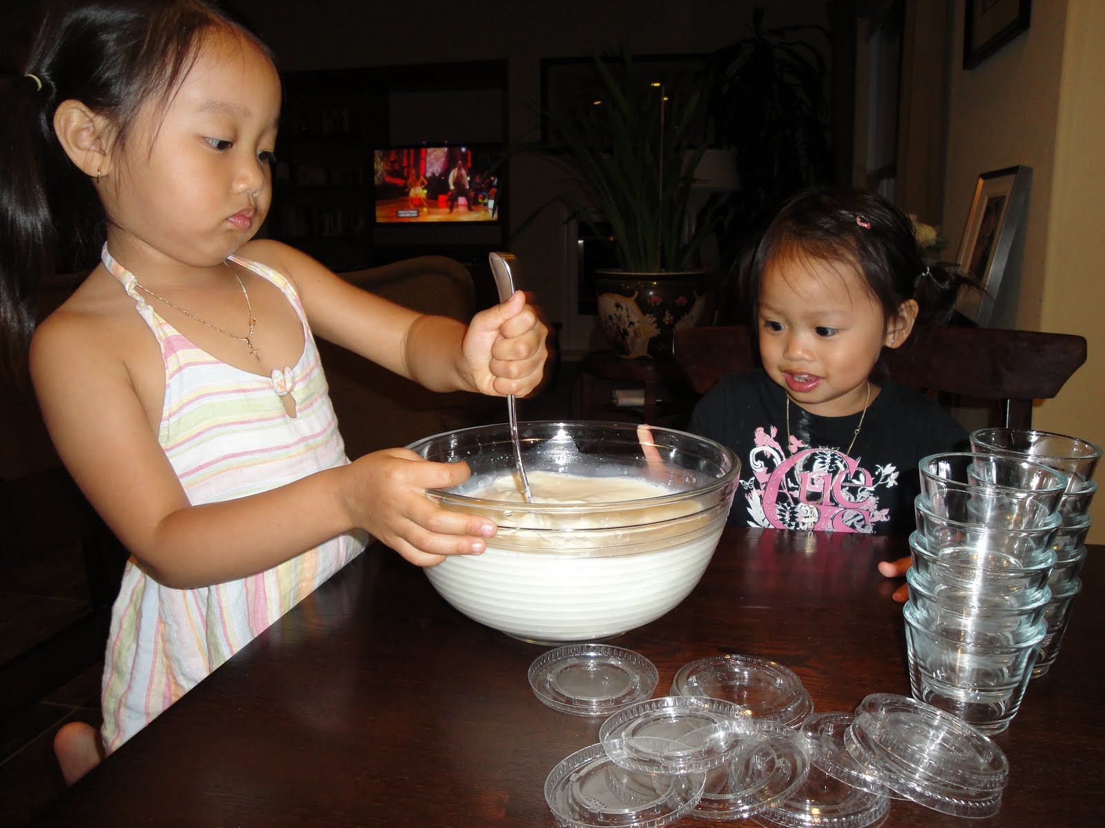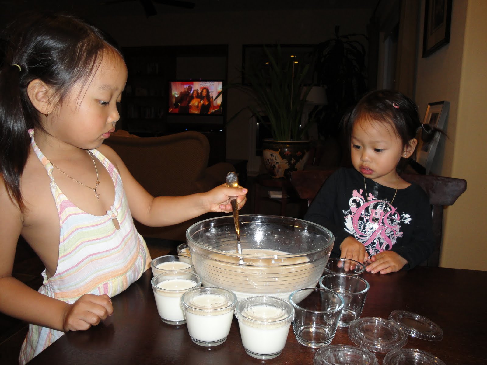 I always like the taste of Vietnamese yogurt. It’s simple, smooth, sweet, creamy and slightly tart. I like to freeze it and let it thaw for about a few minutes or microwave for about 10 seconds before eating it. In the picture above, I made 3 kinds of yogurt: Vietnamese-style yogurt drink, fruity yogurt and just plain yogurt. My oldest daughter’s favorite one is the yogurt drink; I just poured a jar of plain yogurt in a tall glass, add some crushed ice, squeezed some lemon and lime, and added a teaspoon of sweetened condensed milk. Then mixed them up. She just loves the sweet-tart and wonderful aroma of the yogurt drink.