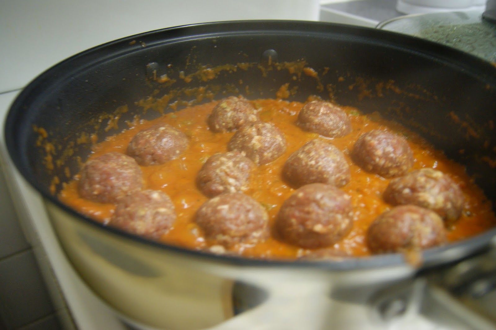 Transfer the mixture to a blender and blitz until smooth (or use a hand blender), return to the pan and place the meatballs in the pan spaced a little apart and poach in the sauce for at least 5 minutes, covered, before gently turning around as you don’t want them to break up!