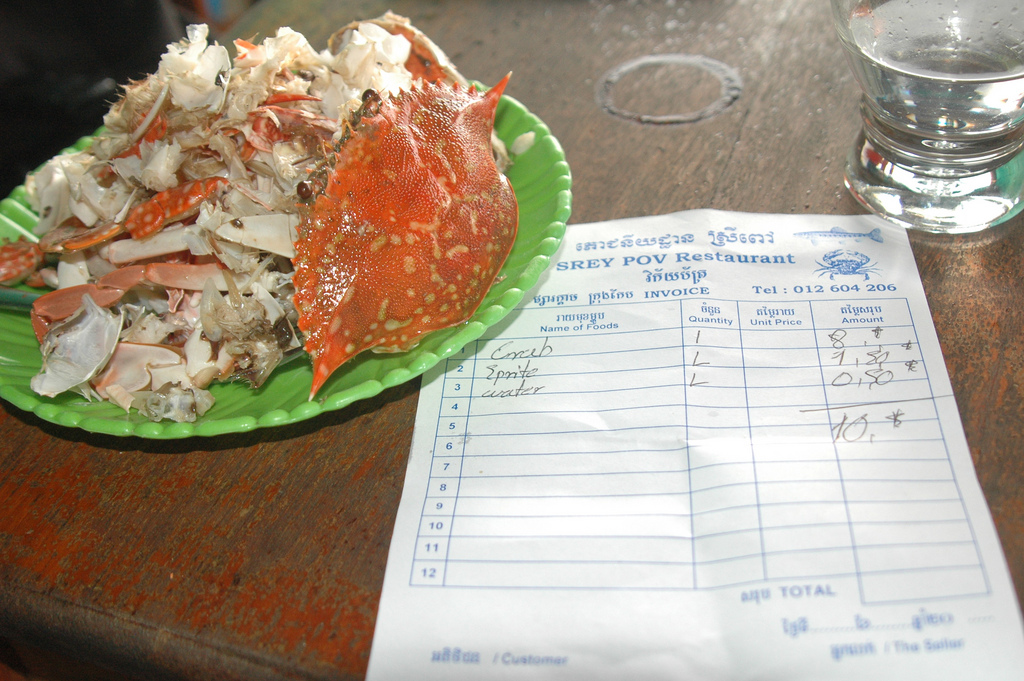 Freshly-boiled blue swimming crabs crunched and cracked as the high tide lapped the edge of the restaurant shack in Kep. If you thought picking a crab from a tank is fresh, we watched as the waitress disappeared out of the front of the restaurant to reappear with the crab ladies on the rocks behind us. A crab lady then waded out to her reed-woven pots, pulled one ashore, picked out a few meaty crabs from the tiddlers, and handed them to the waitress, who tottered back to the kitchen.