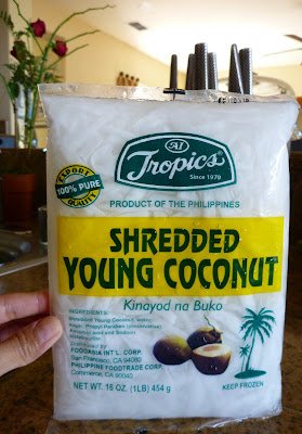 I bought the young coconut three times and had only been lucky once with finding a fresh coconut. The other times, either the coconut juice was murky or tasted sour or the meat was purple. I had to take the loss and toss them. The difficulty with this is you don’t usually know how long they’ve been sitting out; there’s no freshness or sell by date. Learning from this mistake, I’ve developed a backup plan; I buy a bag of frozen shredded young coconut and a few cans or bags of coconut juice that I know I can rely on just in case the fresh coconuts aren’t fresh after all..