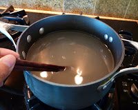 Chop the top of the young coconuts. Measure 7 cups of coconut juice. If there isn’t enough of coconut juice, add water to make 7 cups total. Scrape the coconut meat with a spoon. Cut in into strips. Set them aside. In case your coconut doesn’t have enough meat, get a bag of shredded young coconut meat.