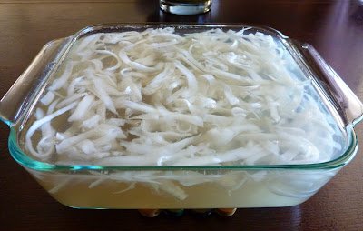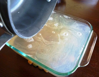 Pour it into a mold. Let it cool down for a few minutes. Scatter coconut strips on top of the jelly. Let it gel in the fridge.