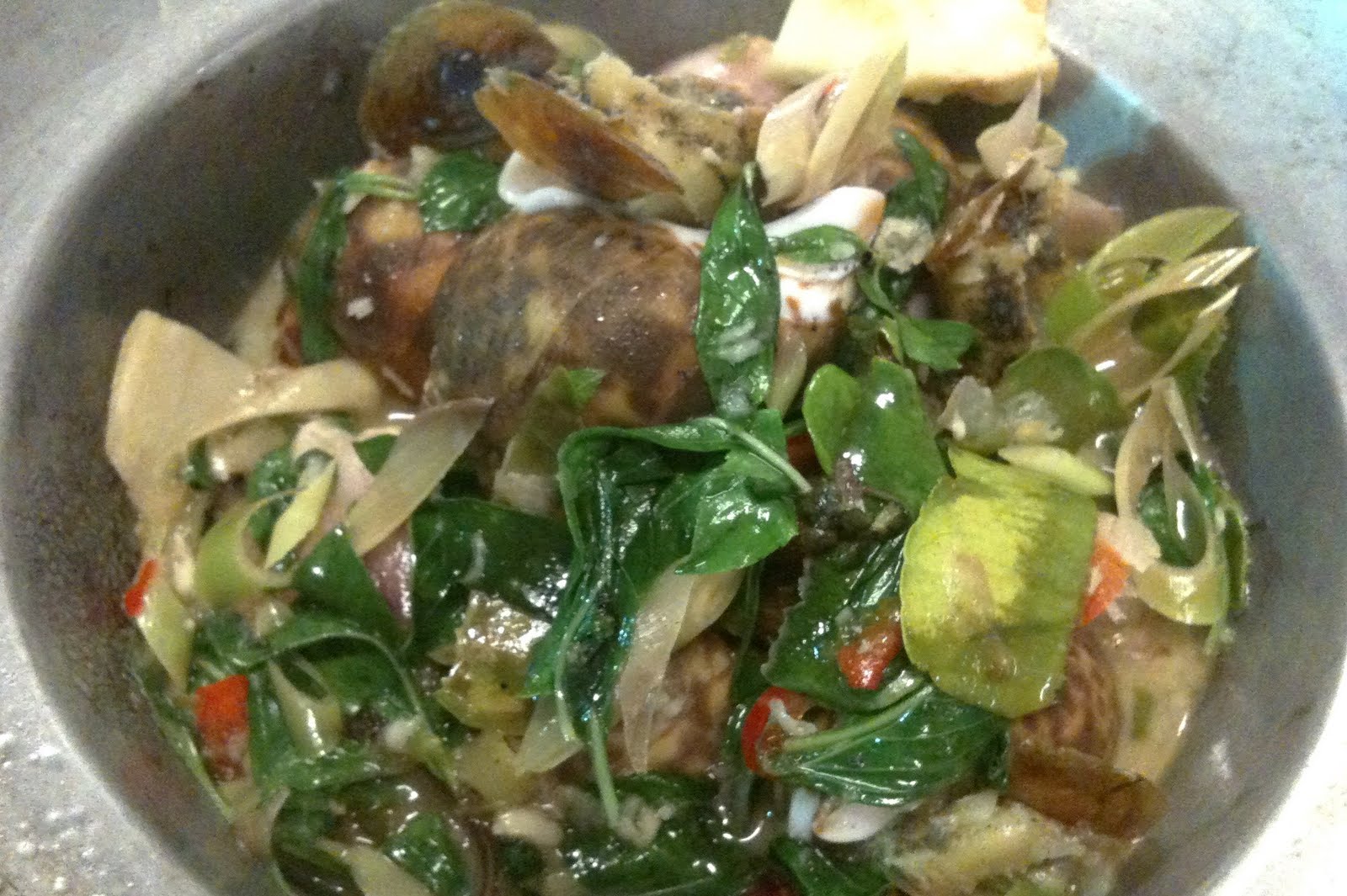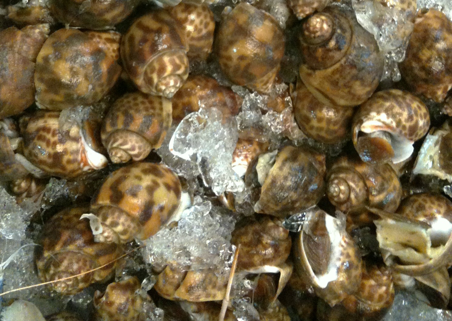 The sea snails were piled up in the corner, like fat brown conches, and the manager only wanted 200 baht (about £5) for half a kilo. I asked how they cooked them, worried that they might turn out dried to foul-tasting grit like the cremated cockles I’d had in Bangkok. She said grilled, or something I didn’t understand. I asked how she would have them and she said something I didn’t understand, so I went for that.