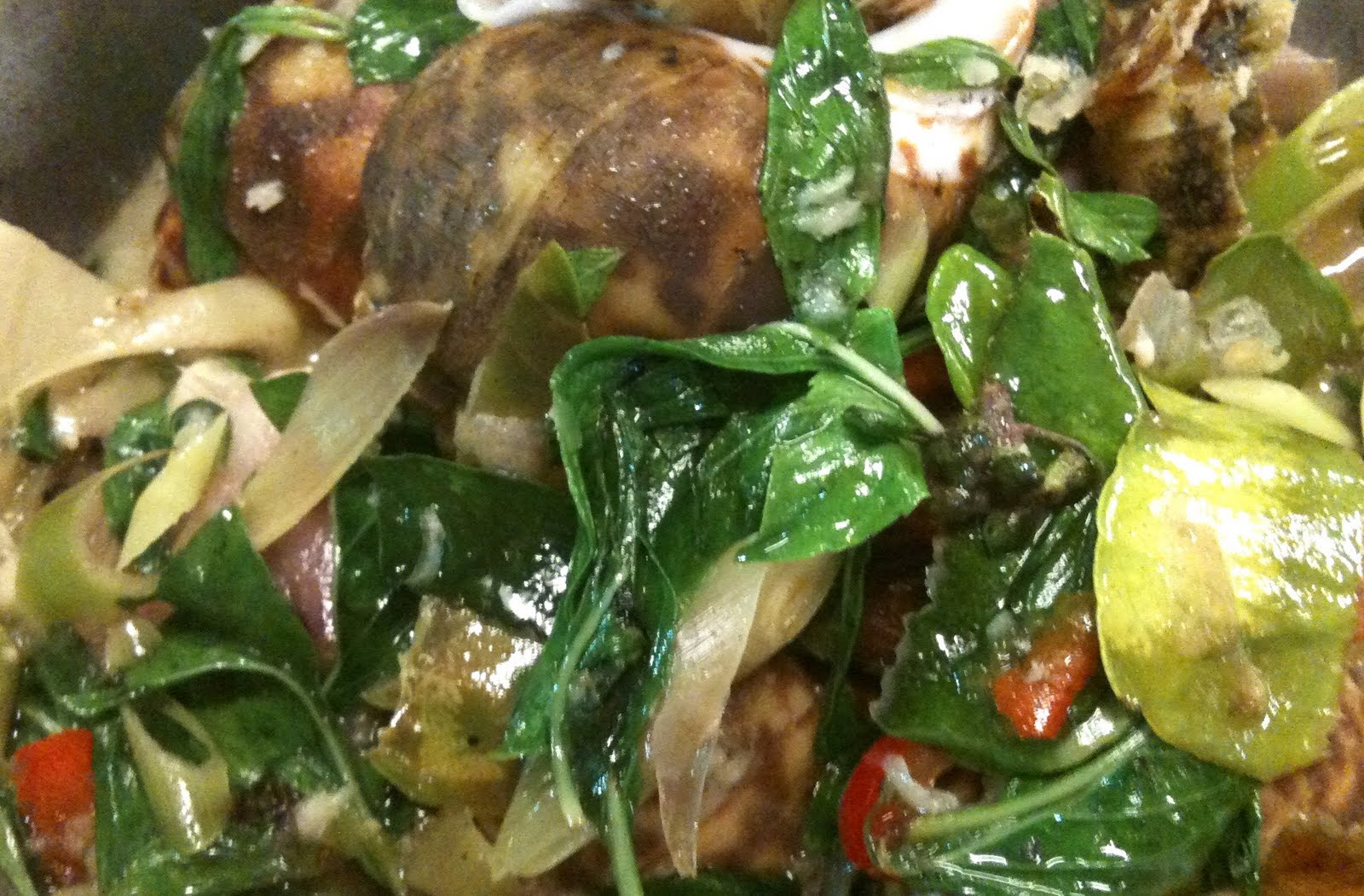 The broth the snails were cooked in was absolutely fantastic. It was hot and sour, and filled with whole pink shallots, lime leaves, fresh basil sprigs, lemon grass, thick coins of galangal, and slices of red chilli. The snails themselves were beautifully cooked, and much firmer than whelks. There was no chewiness though, just like you get when you order fresh whelks at a decent seafood restaurant in Europe. They really were superb.