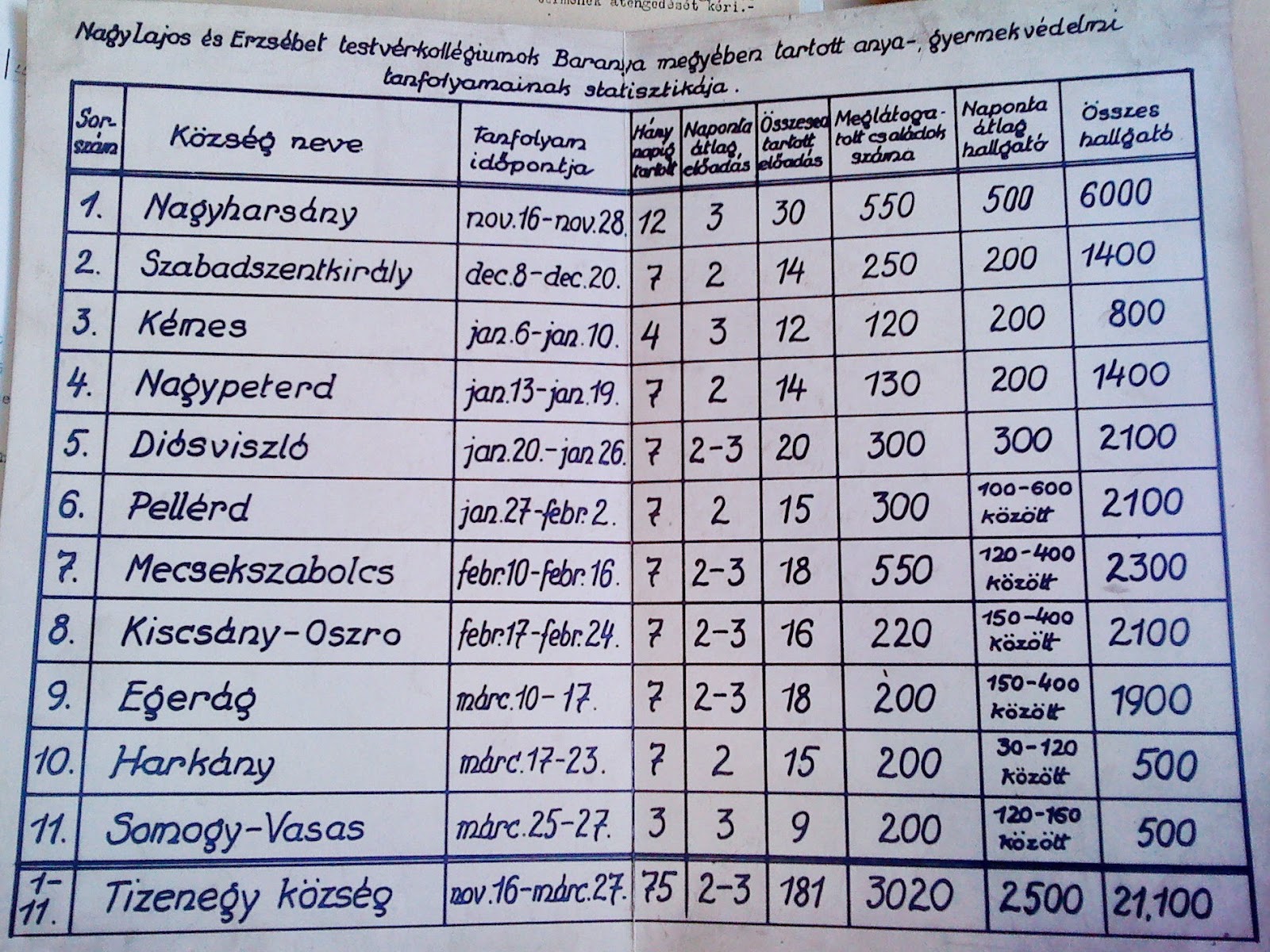 In the same academic year Prof. Entz launched a mothers’ and children health protection project in Baranya County. During the 4-7 day courses the (mainly) last year medical students from the afore-mentioned student hostels gave lectures on infant and child healthcare and public health. The statistical data sheet contained only estimated numbers on attendance, and none on the students who took part.[xvi] According to this chart they called on 11 villages during 75 days, they gave 181 lectures, which were attended by 21,000 people. Prof. Entz underlined the usefulness of this work for the students: