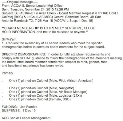 Meanwhile, there’s a rather large elephant in the hearing room–one that is always avoided at any cost.  The issue is diversity/political correctness and it’s impact on today’s military.  Consider this “close hold” memo on the desired composition of a recent Air Force promotion board, uncovered by Tony Carr, the retired Air Force Lieutenant Colonel (and former squadron commander) who now runs the essential John Q. Public blog: