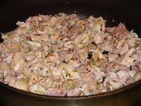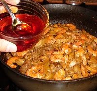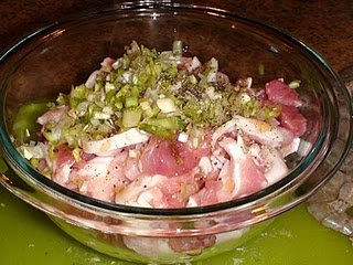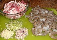 Heat the oil in the pan. Add the shallot, garlic and saute until golden. Toss in the pork and stir for a few minutes until the curls and lose its pink color.