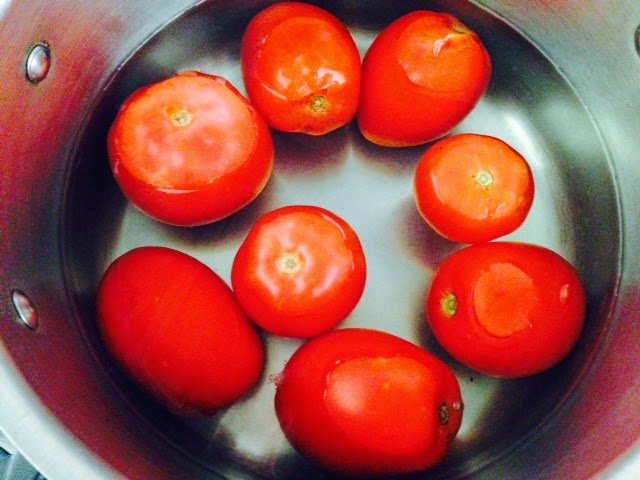 Place a pot with water over high heat and bring it to a boil. Lower the tomatoes into the water gently and leave them there for 1 minute.