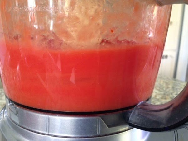 Put these peeled tomatoes in a food processor or blender and process until coarsely pureed. Set it aside.