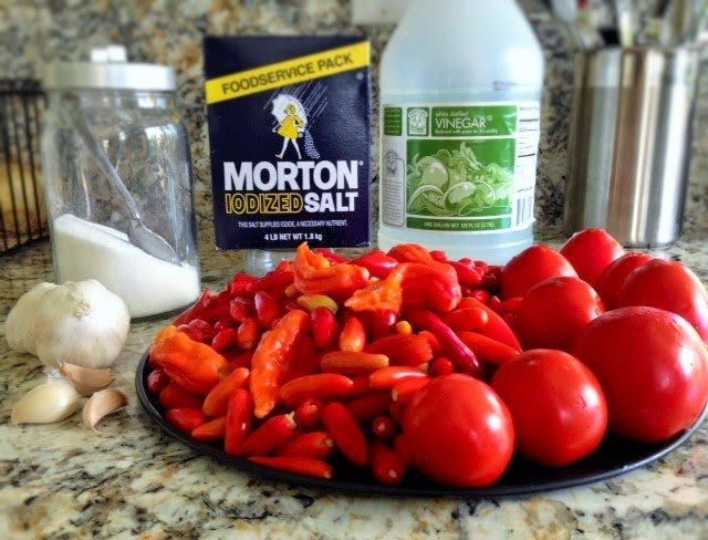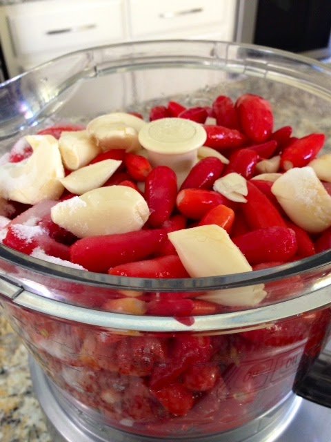 Place chilies, garlic, vinegar, salt and sugar in a food processor or blender and process to a coarse pureed.