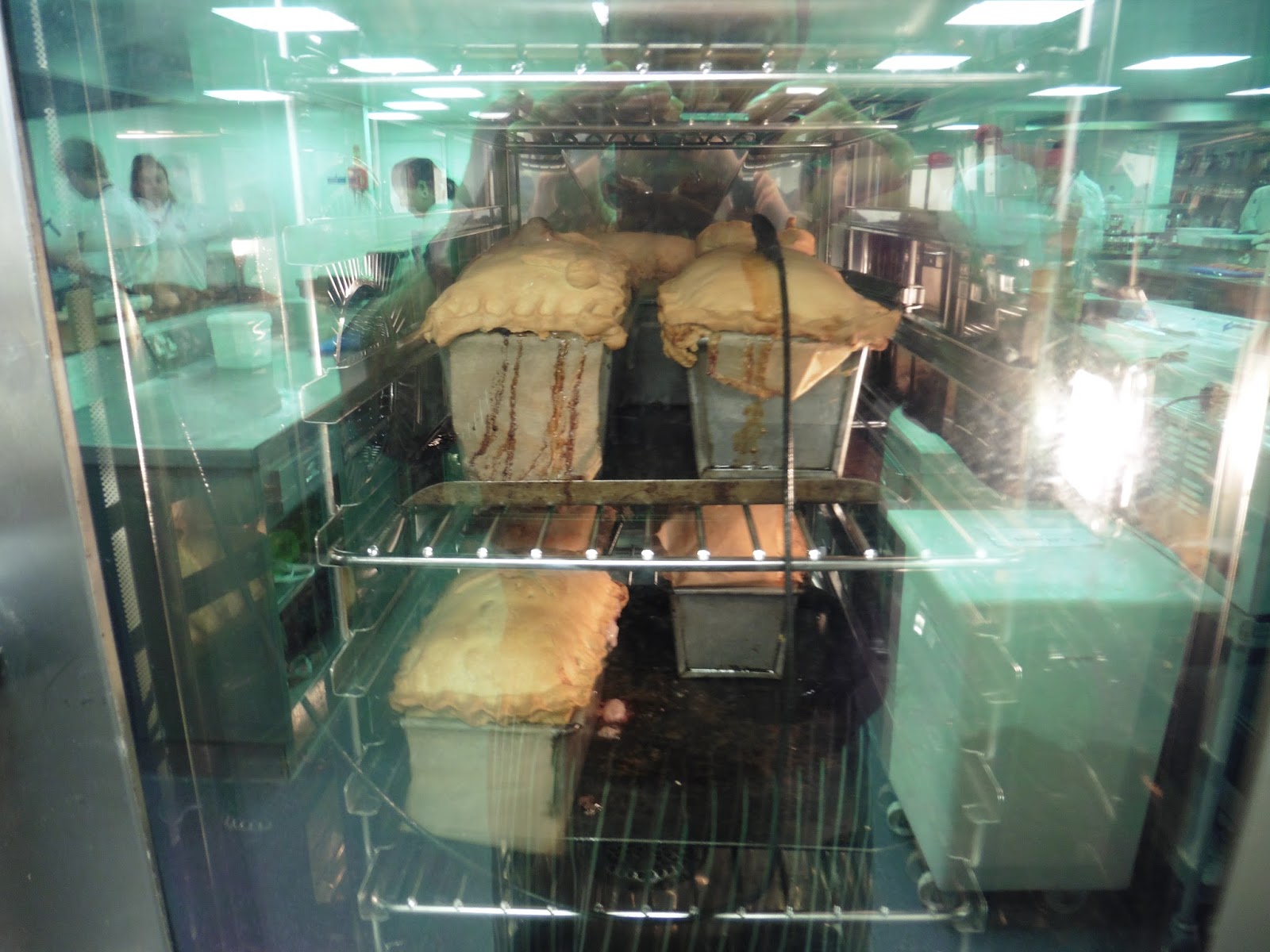 We cut a hole in the top to allow the steam to escape, and baked the pies at 160C in a steam oven for about an hour. You know it’s ready when the middle of the pie is 75C. Take the pie out of the oven and carefully remove from the tin using the overhanging paper. Then let them cool on a wire tray.