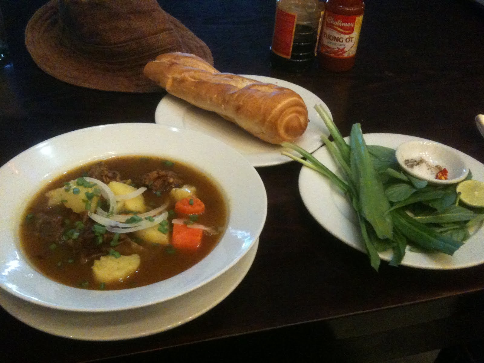 There’s nothing quite like mopping up a hearty stew with bread, and that’s how it comes in Vietnam – banh mi – with a lovely fresh baguette to wipe up every smear of juice. But there’s other stuff too: the ubiquitous plate of thorny coriander and basil leaves for vitamins, and usually a small saucer of Kampot pepper, sea salt, chopped chilli and a lime quarter to squeeze in and stir into a paste – which takes the dish from superb to sublime.
