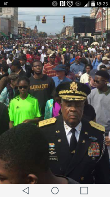 We refer to the photo above, which (ostensibly) shows a retired African-American Lieutenant General, joining the marchers in Selma to commemorate that epic moment in the civil rights movement.