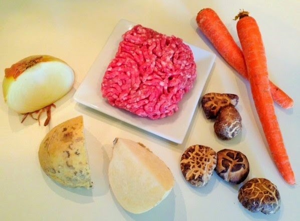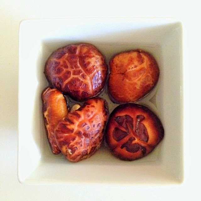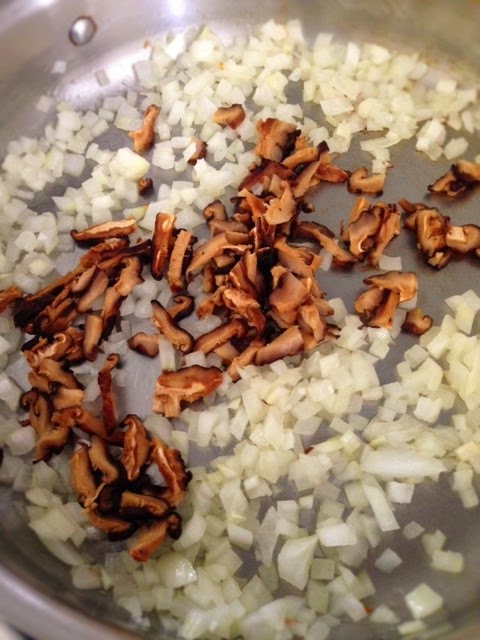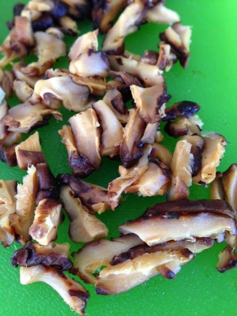 Soak mushrooms in hot water to speed up the process if necessary. Otherwise, room temperature water is fine. When mushrooms are soft, slice thinly. Make 1/2 cup. Set aside.