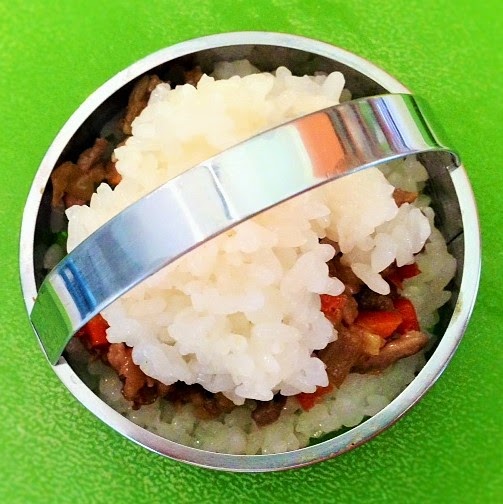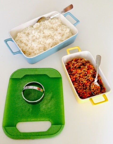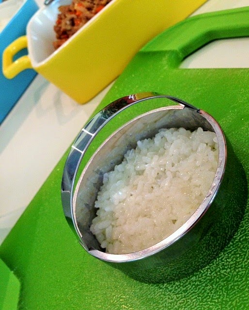 Place sweet rice in 1/3 of the cookie cutter. Dip your fingers in the water bowl, then press the rice down with your fingers.