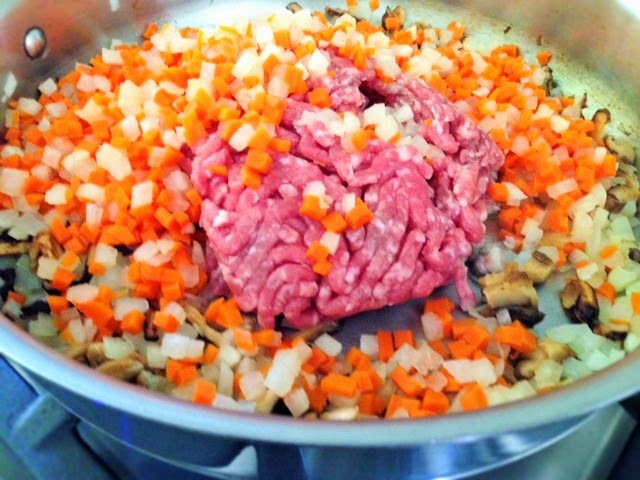 Bring a pan to a medium-high heat, add oil, mushroom, and onion. Saute until fragrant.